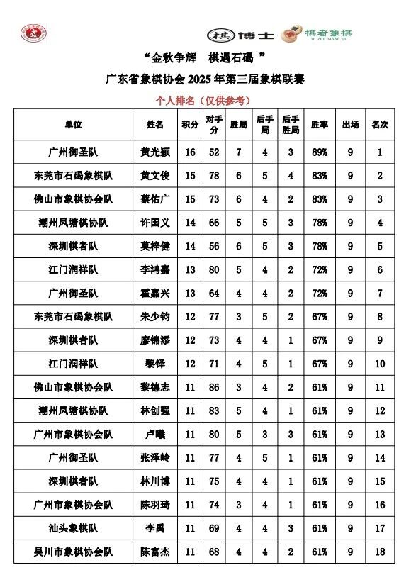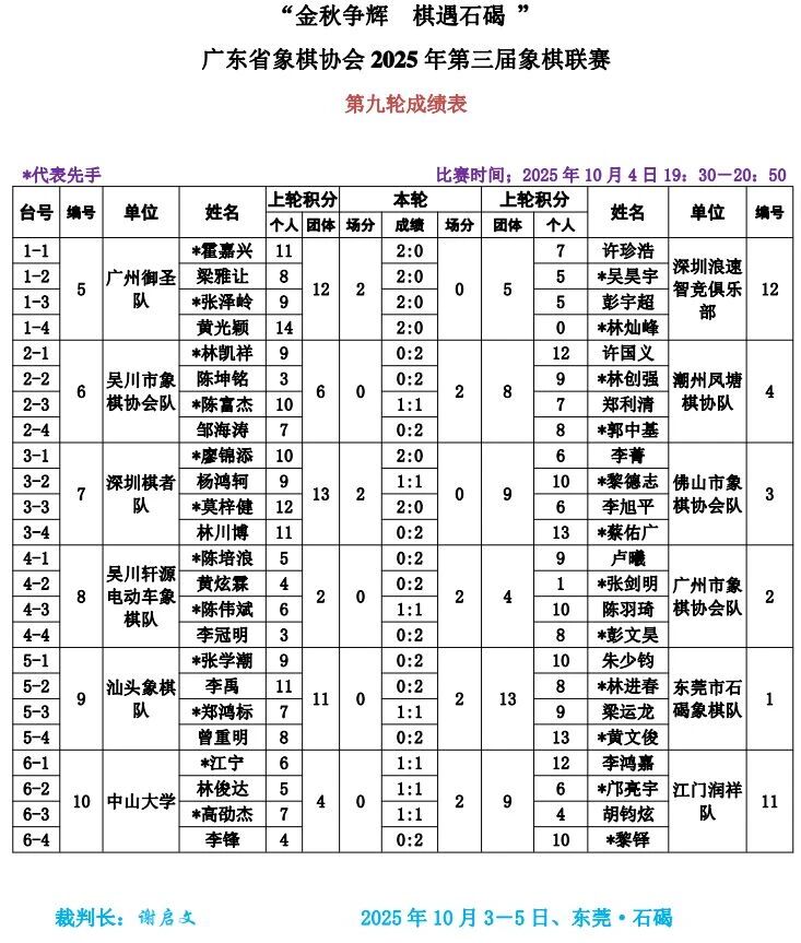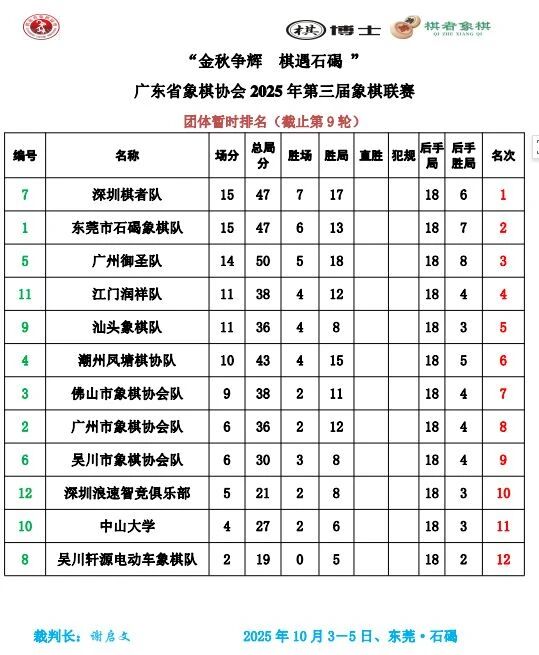 10月4日晚,广东省第三届象棋联赛在东莞石碣天悦酒店战罢9轮,东莞石碣队与深圳棋者队积15并驾齐驱,广州御圣队积14分紧紧相随,赛前呼声最高的三强争霸格局正式形成。