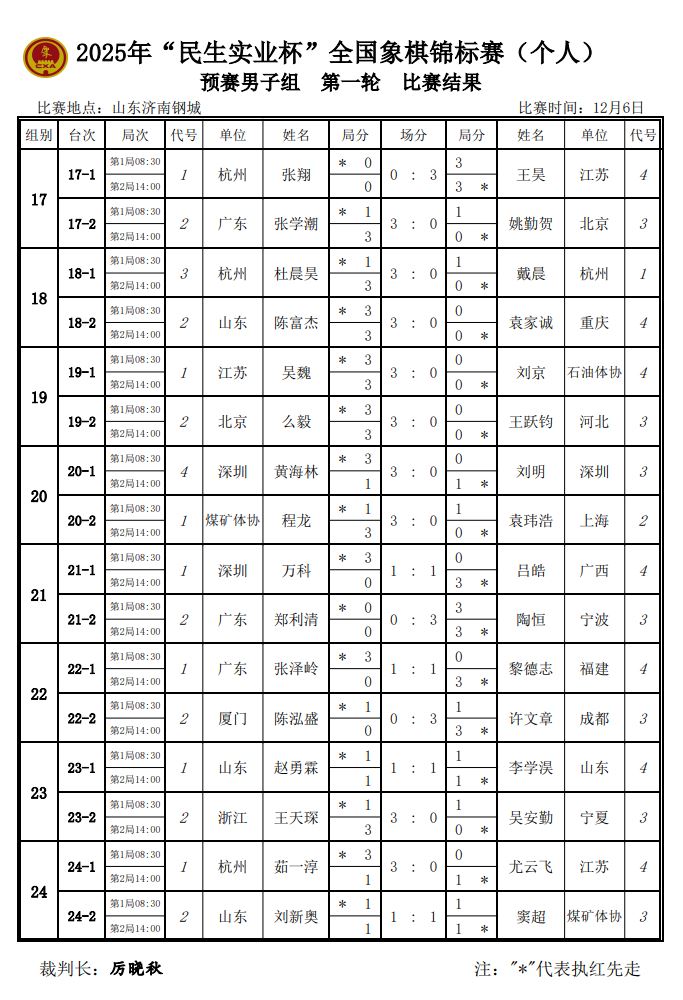 2025年民生实业杯全国象棋个人赛男子组预赛第一轮比赛结果