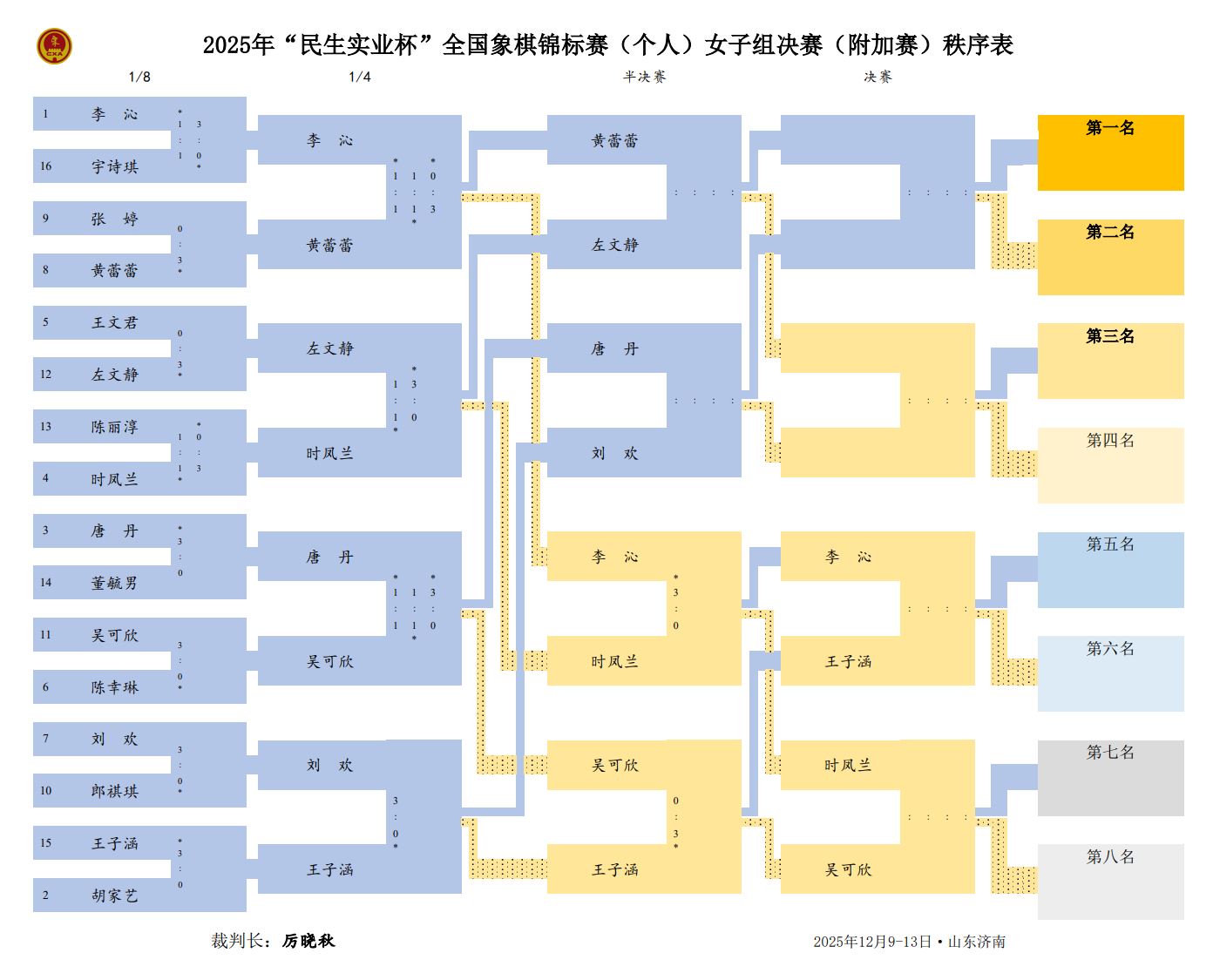 女子组第五至八名附加赛结果:中国象棋协会竞赛积分排行榜一姐江苏李沁、河北王子涵执先分别击败广东时凤兰、浙江吴可欣,两人将向第五名发起冲击。