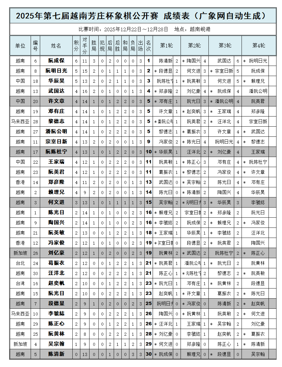 2025年第七届越南“芳庄”杯象棋公开赛:信息 排名 英文 对阵 统计 棋谱