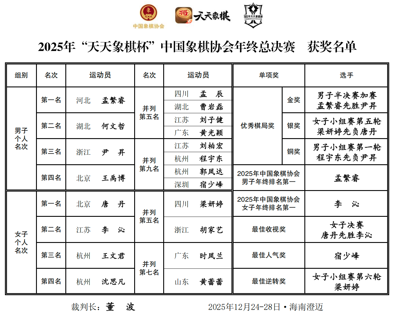 12月28日,2025年“天天象棋杯”中国象棋协会年终总决赛在海南澄迈落下帷幕,经过了为期五天的激烈争夺,孟繁睿、唐丹分别摘得总决赛的男、女桂冠。