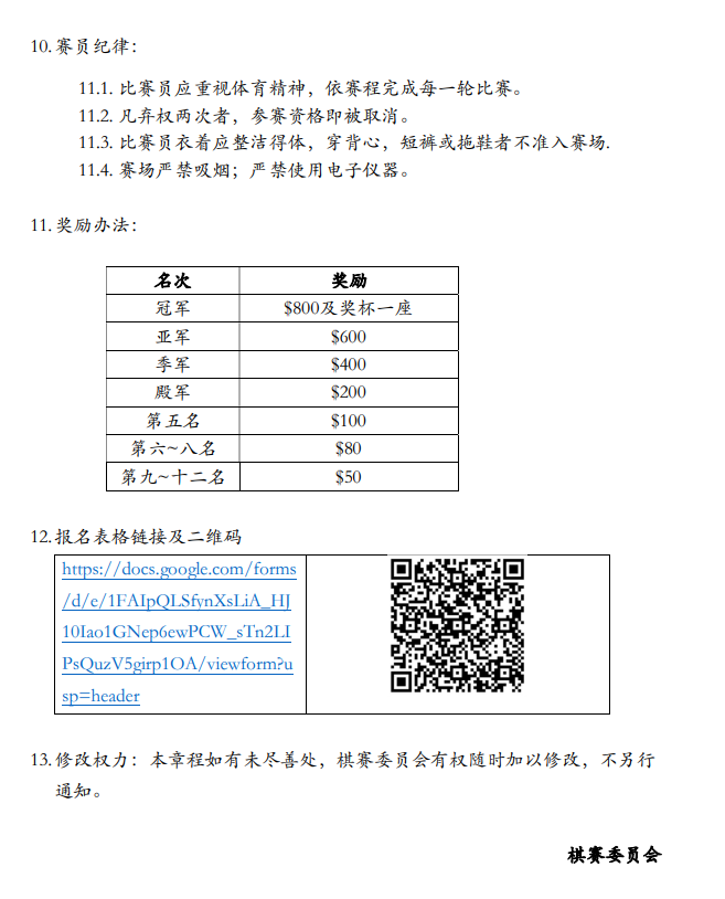 本章程如有未尽善处,棋赛委员会有权随时加以修改,不另行通知。