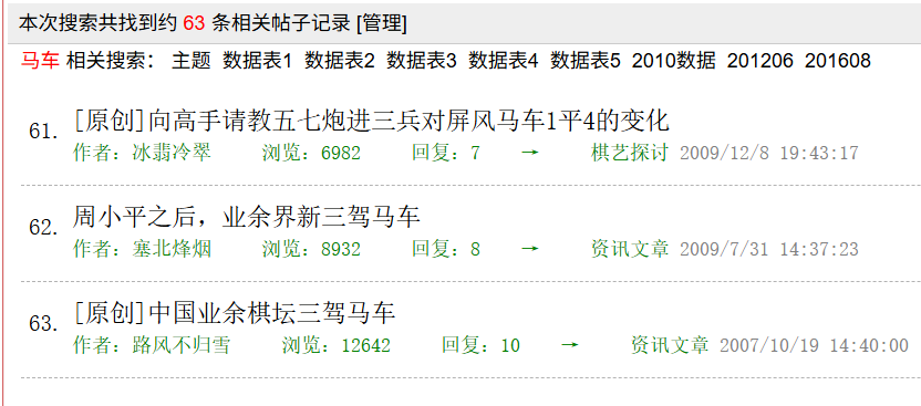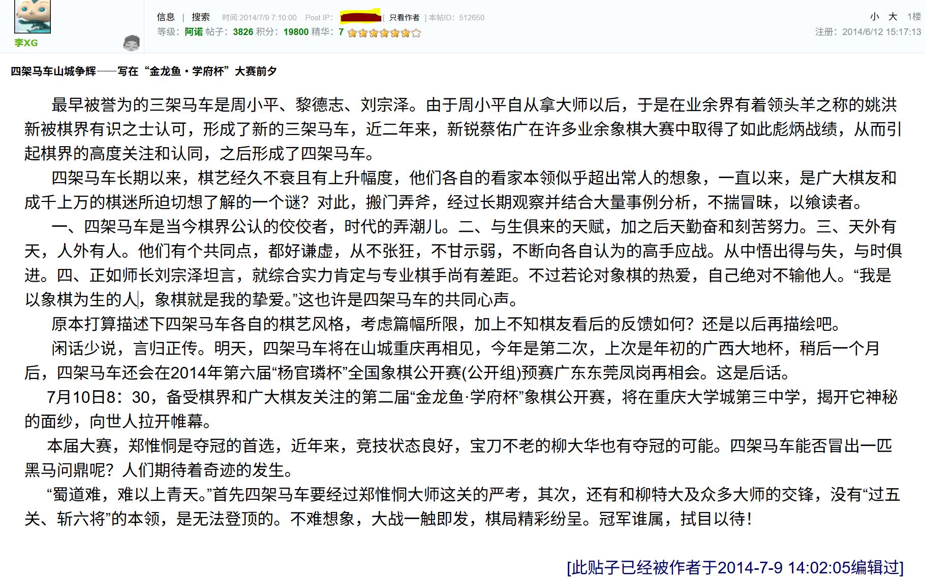 2007年10月19日,棋友“路风不归雪”率先在论坛发帖,将周小平、刘宗泽、黎德志评为业余棋坛“三驾马车”,盛赞三人参赛频次最高、战绩最丰,是无数棋迷追逐的榜样。2009年,周小平晋升国家大师后淡出棋界,棋风正统稳健的河南“棋王”姚洪新凭借实力补位,新的“三驾马车”格局由网友"塞北烽烟"提议并被广泛认可。