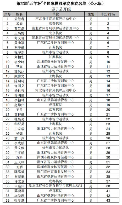 现对第32届“五羊杯”全国象棋冠军赛参赛名单进行公示(见附件),并就有关事宜通知如下。