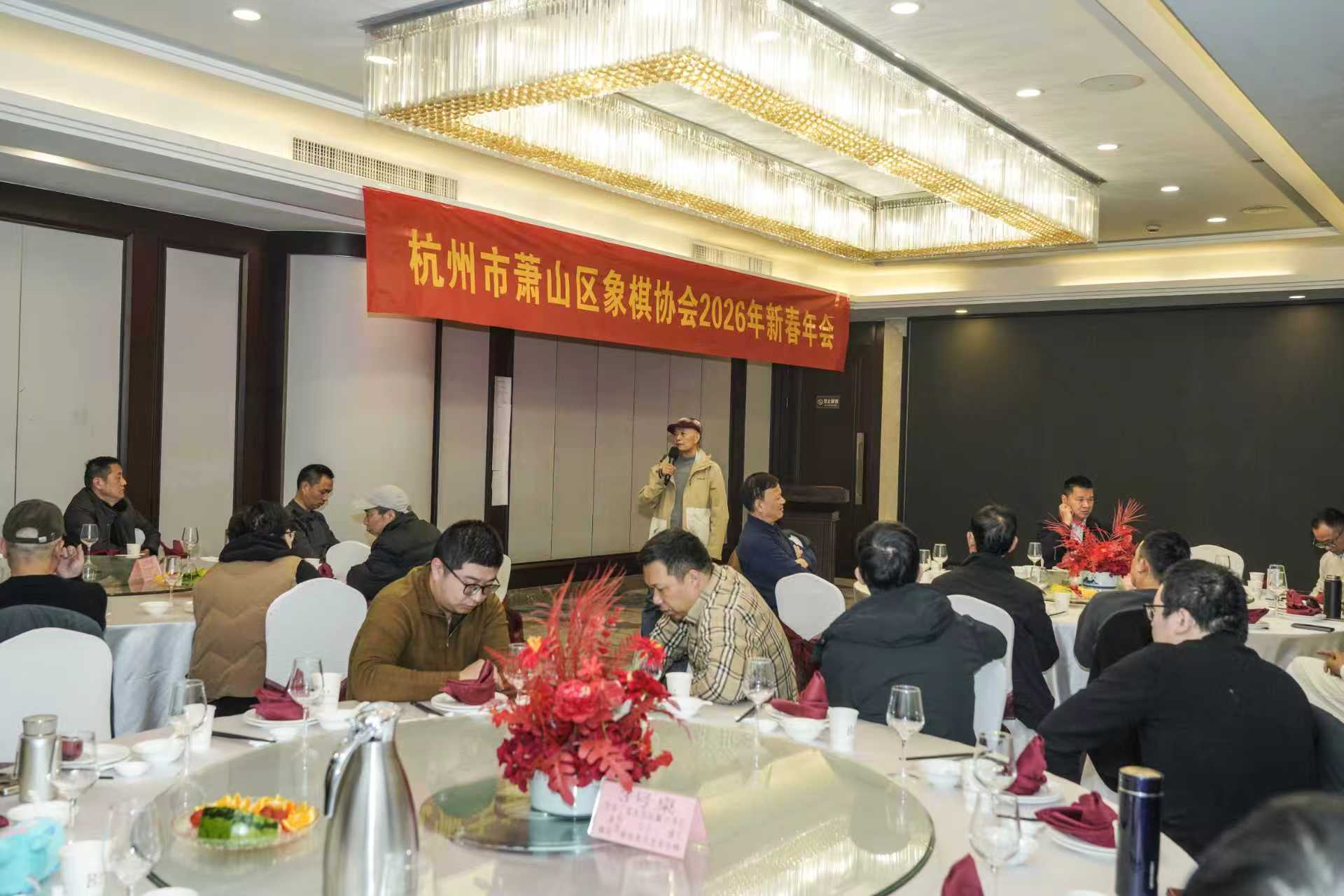 1月17日,萧山区象棋协会在萧山区宝盛宾馆3楼8号大厅隆重举行2026年新春年会,来自滨江、绍兴、柯桥、诸暨四地协会同仁及协会会员共40人出席,年会由协会常务副会长王先贵全程主持。