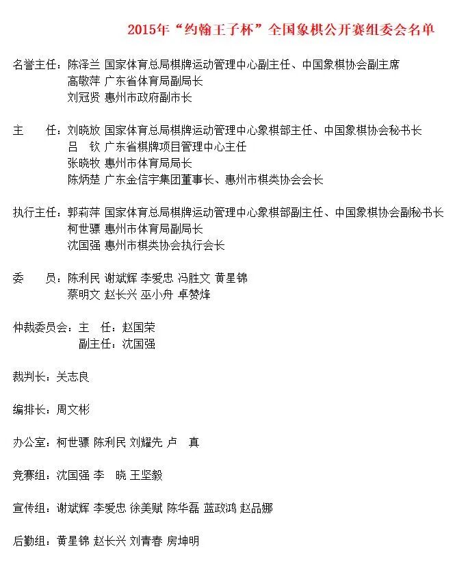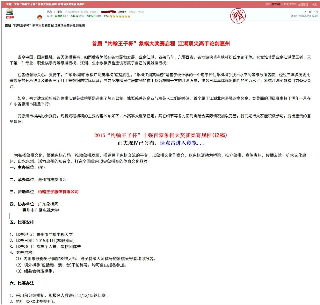 “约翰王子杯”2015年元旦举办,赛事奖励设置豪气干云:总奖金高达188900元,奖励前108名(取梁山好汉之意,这是赛事策划者之一,广东象棋网版主、网名“战斗力第一”卓赞烽的创意),冠军奖金三万元,团体冠军1万元,个人第108名300元。