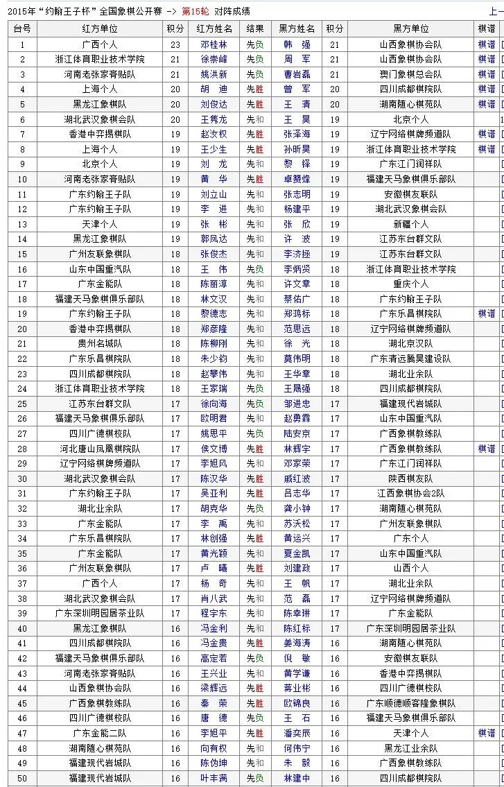 这样的人气数据,在2015年那个移动互联网尚未爆发的年代,堪称奇迹。比赛采用14+1轮同名对决独特赛制:“比赛至最后一轮,取上一轮排前16名的棋手,由第1-2名的棋手对决本次比赛冠亚军,第3-4名对决本次比赛第三、第四名……依此类推,最终排定本次比赛前十六名座次。其余棋手继续采用积分编排制完成最后一轮的比赛。”这种N轮积分编排+M轮同名对决或淘汰赛制,从象棋现状看,仍应该最适宜的赛制,可有效防止很多"盘外招"。