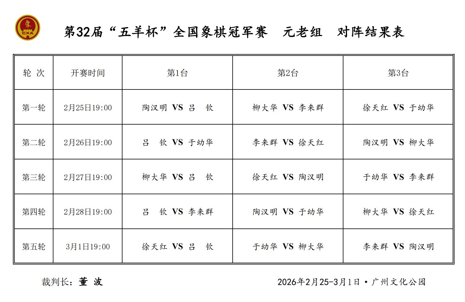 第32届“五羊杯”公开组决赛阶段首轮比赛将于2月25日14时打响,开幕式和元老组首轮赛事则将于当日19时开始,后续每日14时和19时,两大组别将轮番上演精彩对局,冠军将于3月1日产生。