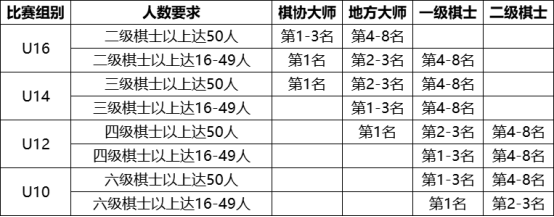 (三)根据《中国象棋协会棋手技术等级管理办法》授予等级称号。本次赛事授予标准如下: