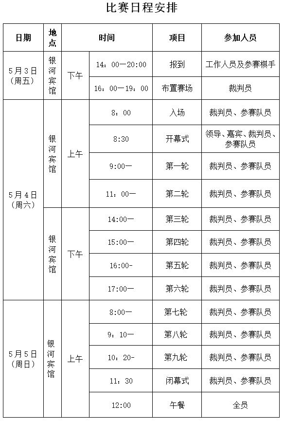 (2)报到:所有报名参赛棋手请准时于5月3日下午14点-19点到银河院宾馆一楼大厅报到,领取参赛证, 4日上午