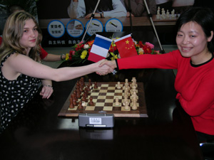 记者谢锐北京报道 一个是风华绝代、名满天下,一个是风姿绰约、冰雪聪明,两位棋后都是那样的聪慧过人,又都是那样的热情大方。4月26日,中国棋后谢军与法国棋后斯科里普琴科在北京爱国者国际象棋俱乐部进行了一场特别对抗。说是特别,一是比赛在斯科里普琴科临回国前才安排;二是她们较量的既不是国际象棋,也不是中国象棋,而是中西象棋合璧的“爱国者象棋”(以前被称作“综合象棋”)。这种象棋的特殊之处在于,在国际象棋中加入了中国象棋的“炮”,而且,其创始人、北京华旗资讯总裁冯军坚持“炮”的形状还是中国象棋式的,意即中西融合。在一堆立体的国际象棋中,放入四个平面的中国“炮”棋子,这种创意的确够新鲜和大胆的。