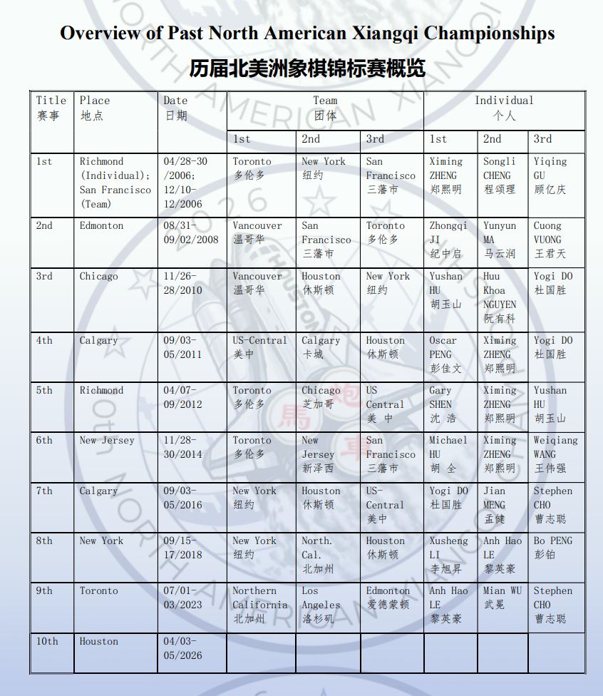 前九届赛事,郑熙明、胡玉山、纪中启、彭佳文、沈浩、胡全、杜国胜、李旭昇、黎英豪等名将在此一展身手并依次夺得个人第一名,多伦多、温哥华、纽约、美中、北加州等强队轮番问鼎团体冠军,方寸棋盘间,不仅是棋艺的切磋、谋略的交锋,更见证了象棋文化在北美大陆的落地生根、蓬勃发展。