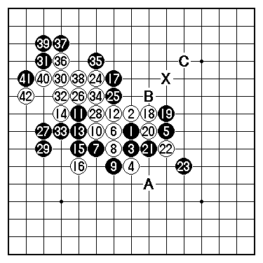 虽然松本久先生尚未获得任何段级位称号,但是大致也有相当于5或6级的水平。上久4级的白4被称为“天地止”,是松月局第4手变化中最强的一招棋。松本的黑5是目前国际最流行的变化。白6最强防御在8位,实战次强手。黑7是日本的老变化,最强走在9位,以下黑优势局面。白8最强防御在21位,实战也是强防的一种。黑9也是最强的攻击手段。白10是多种变化中的一种,到黑17局面定型,双方采用了一系列比较简明的交换下法来处理这个阶段的战役。这样的下好处在于使得局面简明易处理,不致产生误算,但不好的地方则在于往往由于处理的过于直白,就少了很多精妙的变化。白18到20,白棋隐藏了从A、21、B、C的通过VCF来抓黑棋禁手的变化。黑的第21手很好,不仅消除了隐患,而且将白棋下方的联系完全打断。现在这个局面白棋比较难下,需要进入防守了。但是这时上久4级下出了最大的败着,白22活三。这个时候,如果黑棋直接在25位防御,白棋就败了,因为白下方没有连续的VCT追胜法,而黑棋的左上方,白棋是无论如何都防御不干净的。可是,实战的第23手软弱了,居然畏缩的防在了下方,五子棋有句口诀叫:“活三防在连出方”,但是这需要活学活用的,实战的防守虽然符合这句口诀,但是却过于教条了,这也是很多初学者和低级位选手的通病。白24怎肯放过这千载难逢的良机,到白28,白棋在左上方构筑起了新的攻势。黑29有意思的一手棋,很漂亮。但是针对白32活三,黑33的防御不仅落了后手,还给白棋提供了简单VCF的机会。就这样比赛突然结束了,白方获得胜利。事实上,解决这一变化的方案直接在36位防御就是一种。