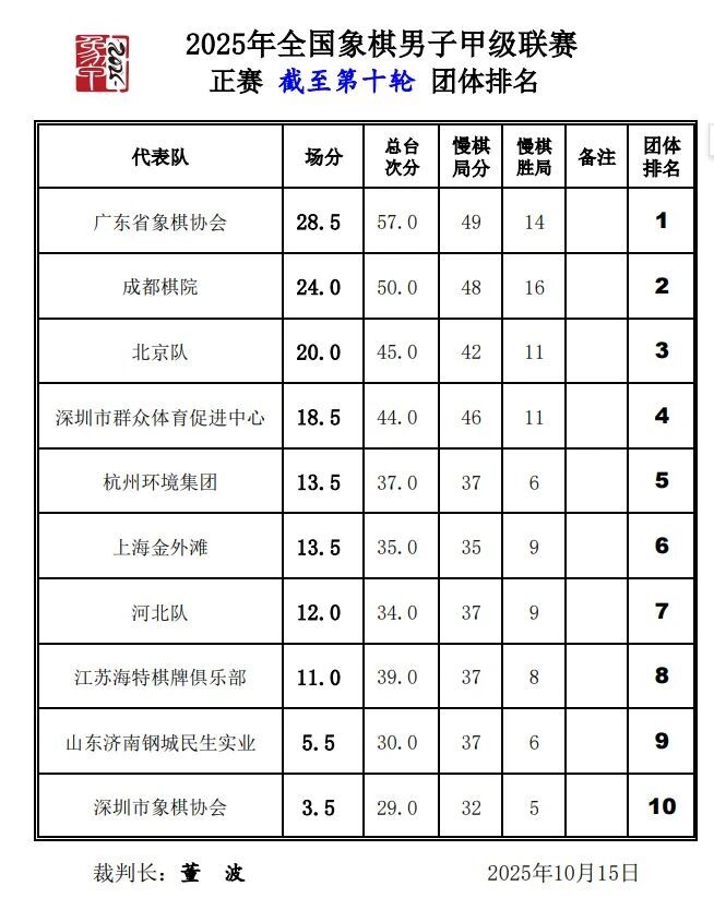 10月15日,2025年全国象棋男子甲级联赛“民生实业杯”第二阶段比赛在山东济南钢城迎来第五个比赛日。本轮第十轮为第二循环首轮,对阵背靠背,各队的对手均为上一轮。焦点战中,广东省象棋协会队凭借特级大师许国义及小将莫梓健的稳定发挥,再次以5:3击败老对手江苏海特棋牌俱乐部,积28.5分,领先第二名4.5分,巩固了优势,成为夺冠热门。