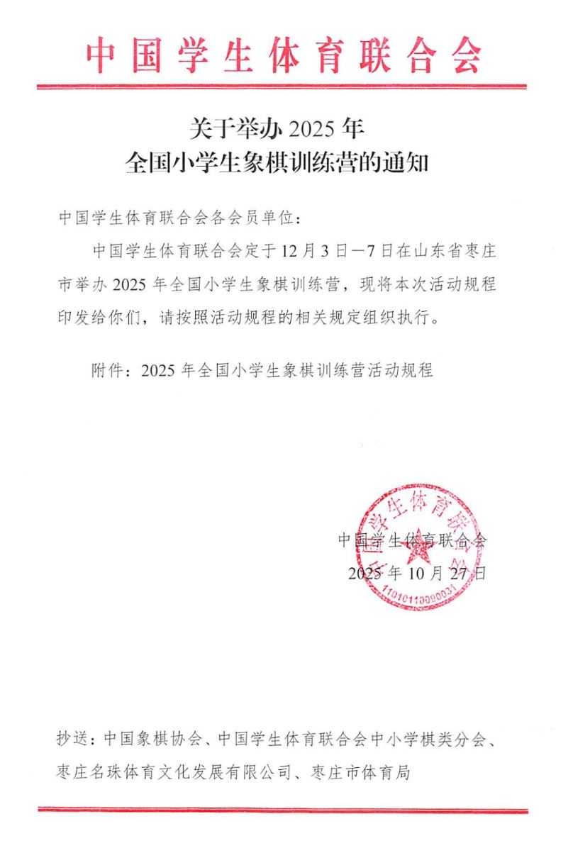 中国学生体育联合会定于12月3日-7日在山东省枣庄市举办2025年全国小学生象棋训练营。