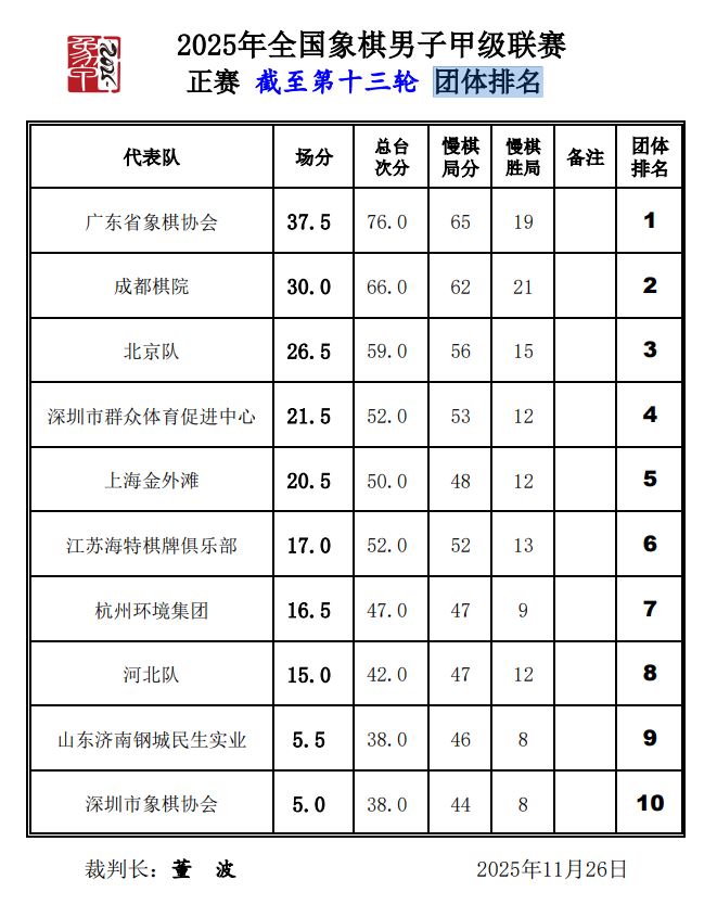十三轮战罢,广东队积37.5分遥遥领先,成都棋院队30分第二,北京队凭借今天小胜积26.5缩小差距,稳固了第三名的位置,预计冠军将在这三支队伍中产生。