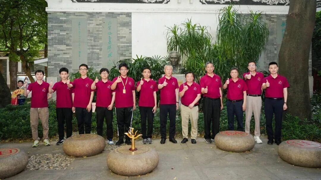 赛参选手在文化公园的杨官璘塑像前合照,象征着中国象棋文化在一代代运动员间中薪火相传。