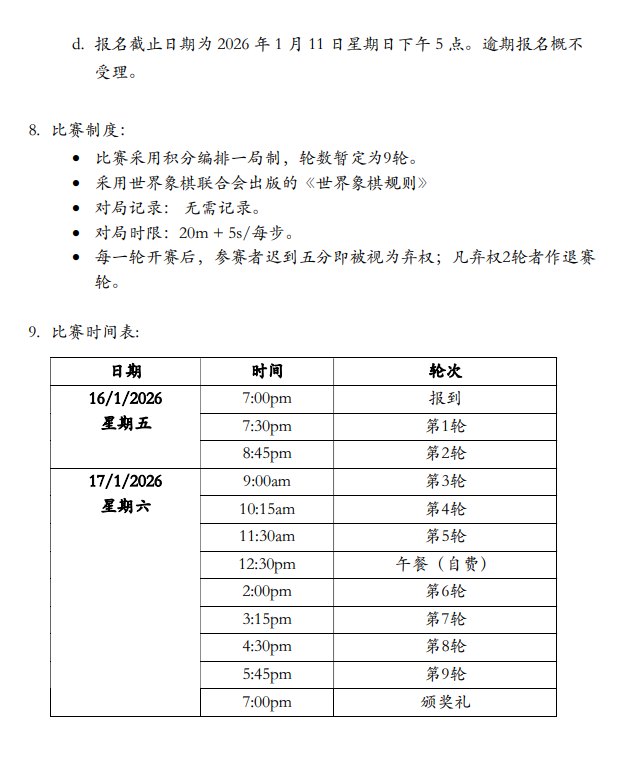 2026"佩玲杯"狮城象棋个人公开赛简章