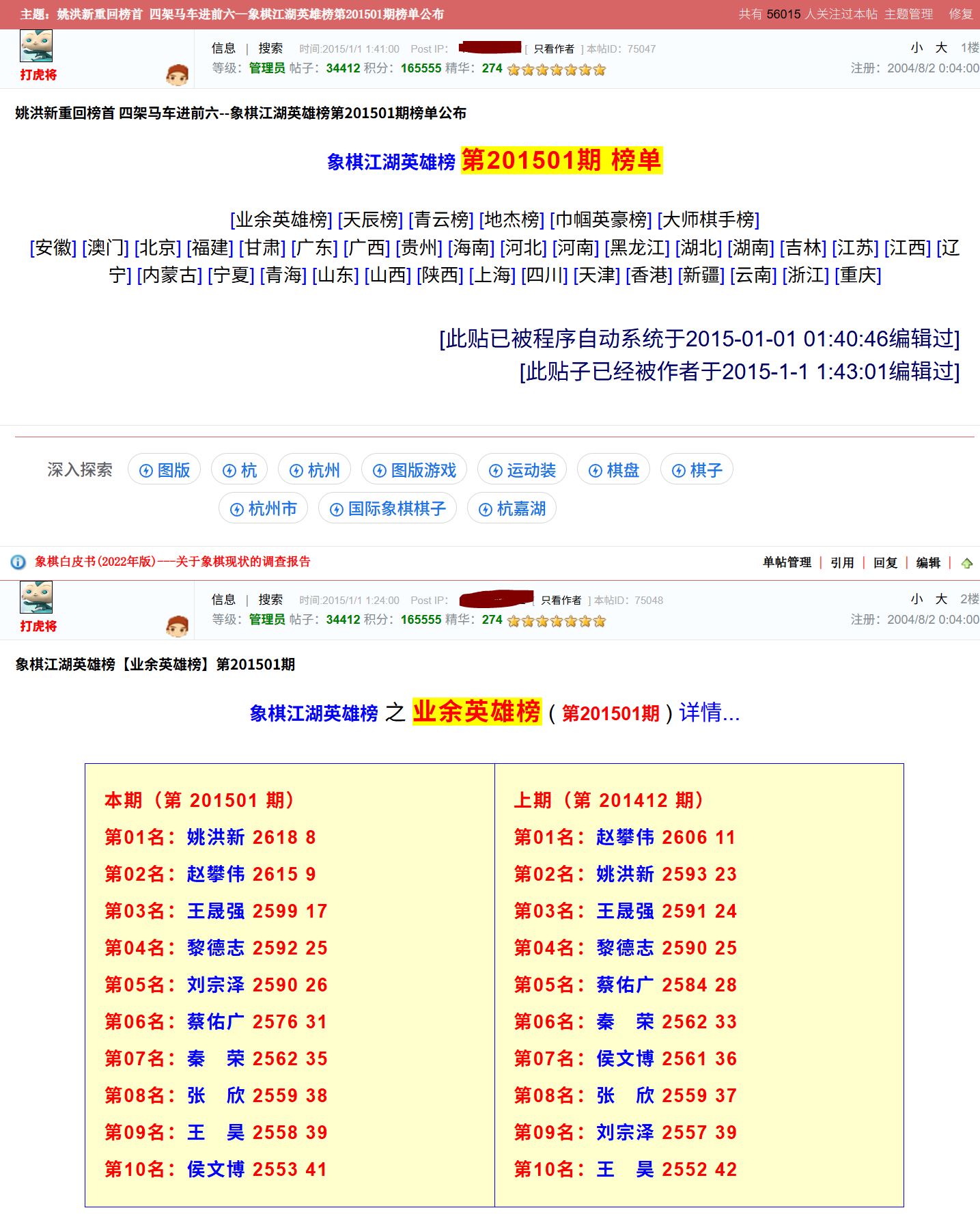 “姚洪新重回榜首 四架马车进前六--象棋江湖英雄榜第201501期榜单公布” 象棋江湖英雄榜 之 业余英雄榜 ( 第201501期 ) 详情: