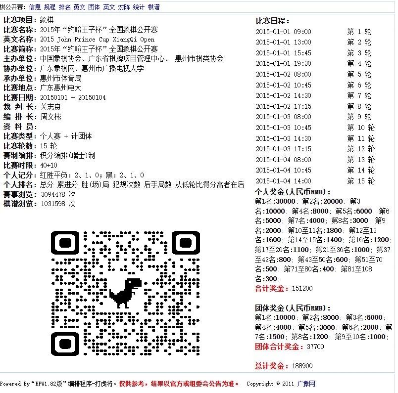 “约翰王子杯”2015年元旦举办,赛事奖励设置豪气干云:总奖金高达188900元,奖励前108名(取梁山好汉之意,这是赛事策划者之一,广东象棋网版主、网名“战斗力第一”卓赞烽的创意),冠军奖金三万元,团体冠军1万元,个人第108名300元。
