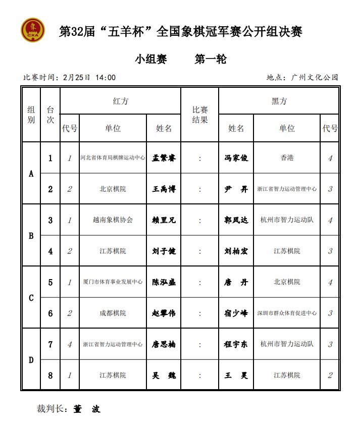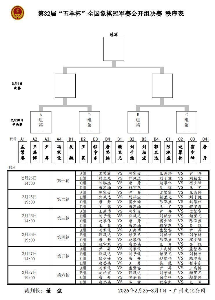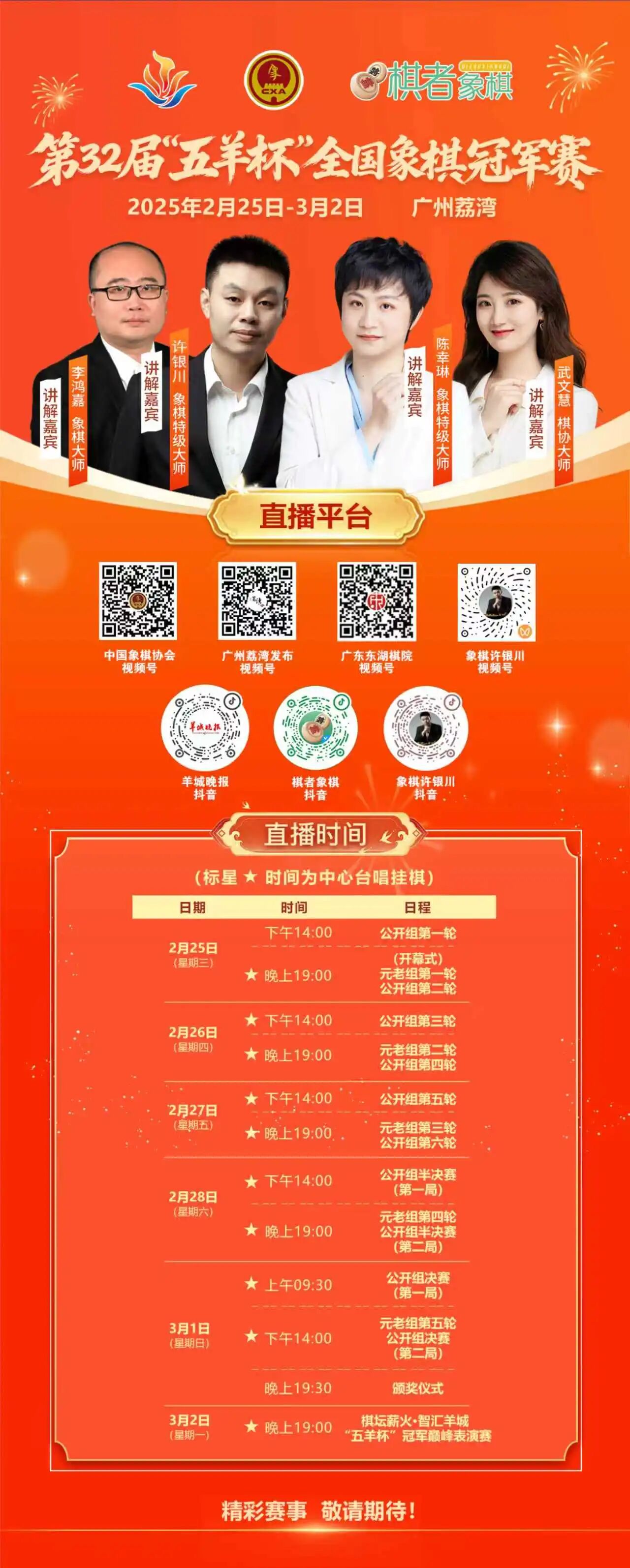 第32届“五羊杯”公开组决赛阶段首轮比赛将于2月25日14时打响,开幕式和元老组首轮赛事则将于当日19时开始,后续每日14时和19时,两大组别将轮番上演精彩对局,冠军将于3月1日产生。