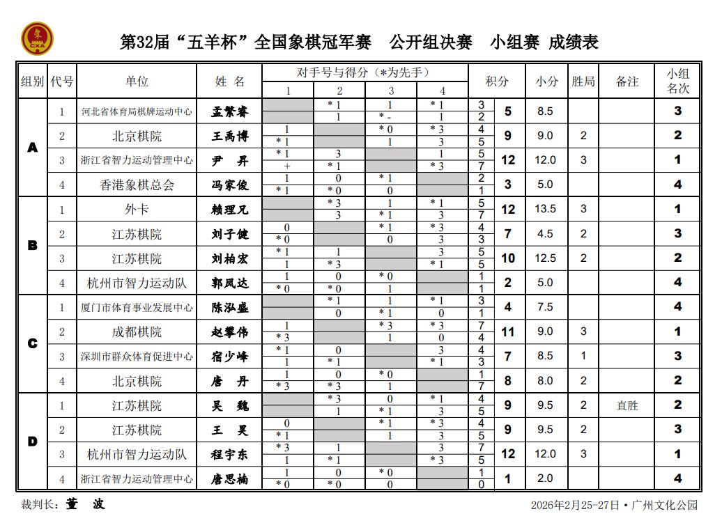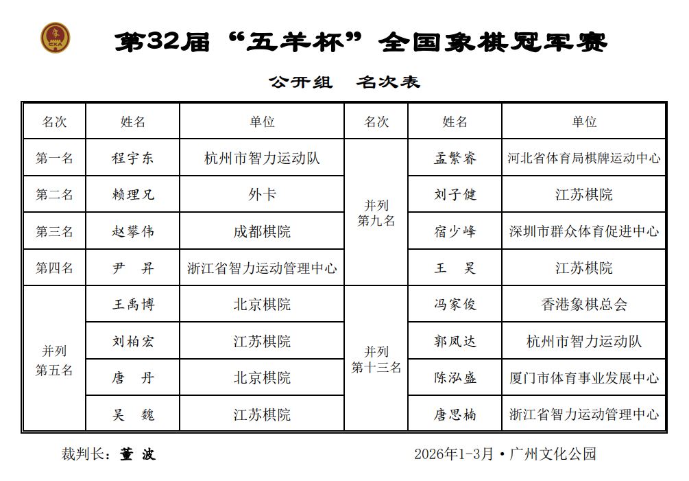 第32届“五羊杯”全国象棋冠军赛获奖名单、成绩册: