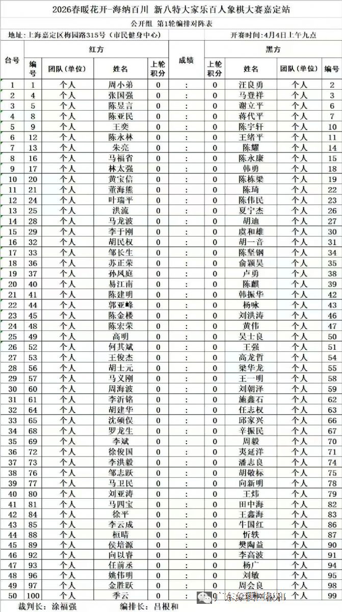 共有 1819 人关注过本帖主题:2026春暖花开?海纳百川 上海新八特大家乐百人象棋大赛(嘉定站 |