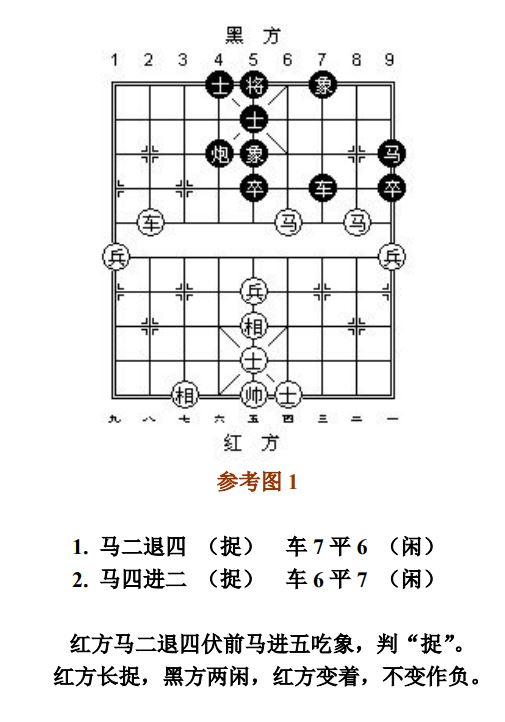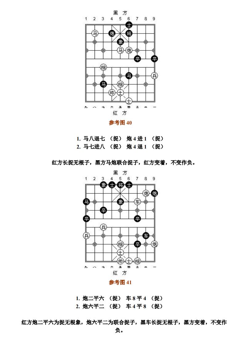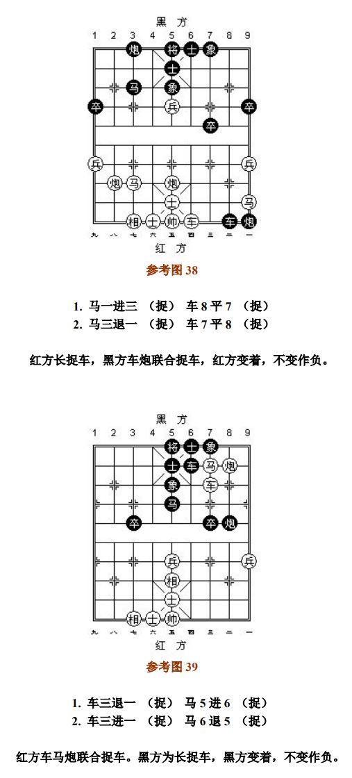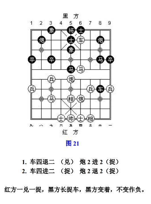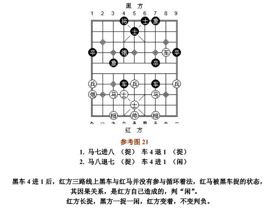 对于献兼捉,被捉子逃离后造成的所"献"子处于被捉状态时,凡与循环着法有关联的子力均应计算在内。若走子前不存在得子,走子后形成净吃子,判"捉"。无直接参与且是己方走子造成被捉的状态,不予考虑;做为根的子,自己离线断根"将军"(或应将),造成被保护的子失根被捉,责任自负。(参考图21~参考图22)