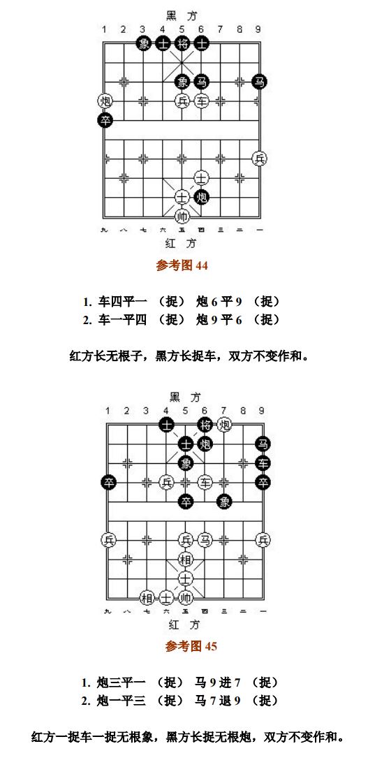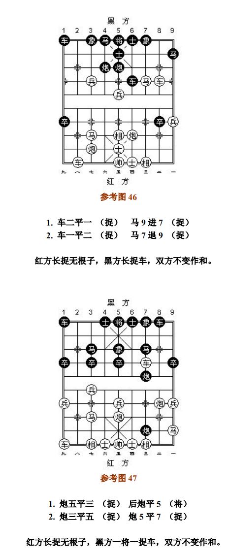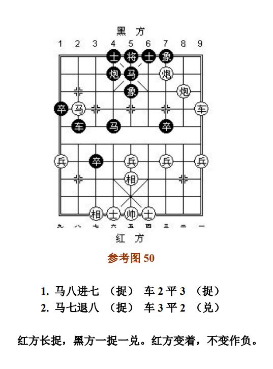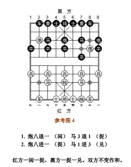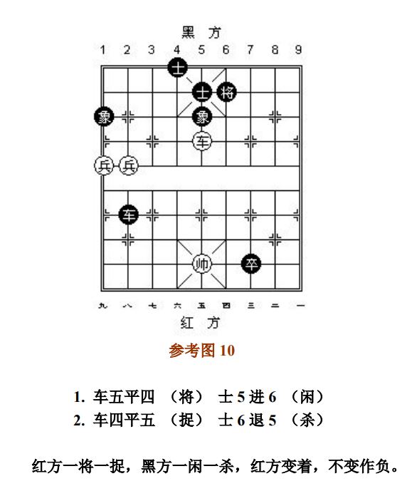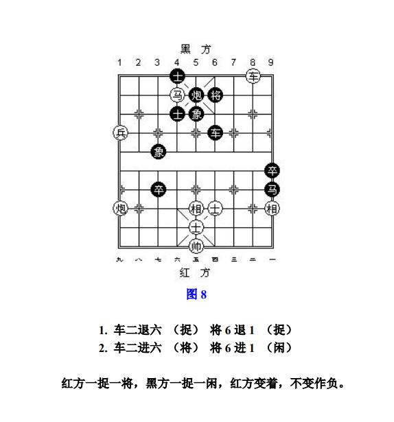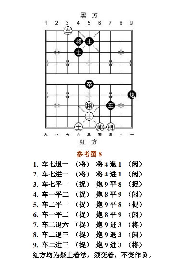24.13 禁止着法:凡单方面走出长将、长杀、长捉、一将一杀、一将一捉、一杀一捉等循环重复的攻击性着法,统称为"禁止着法"(图8、参考图10)。