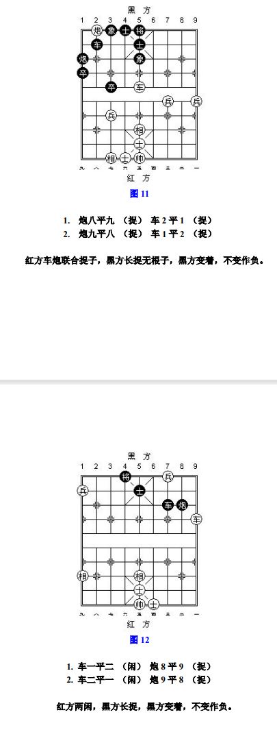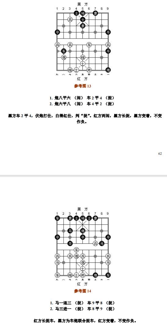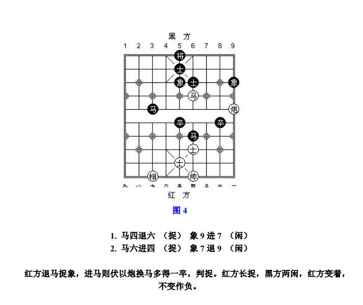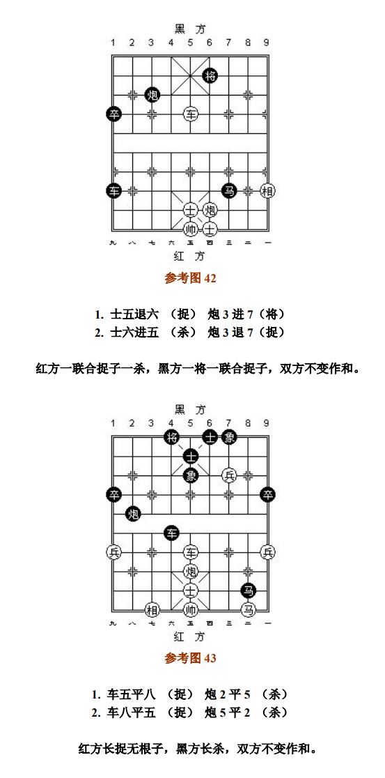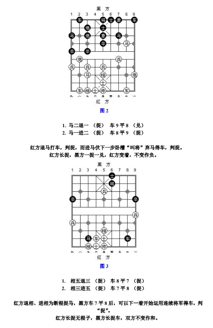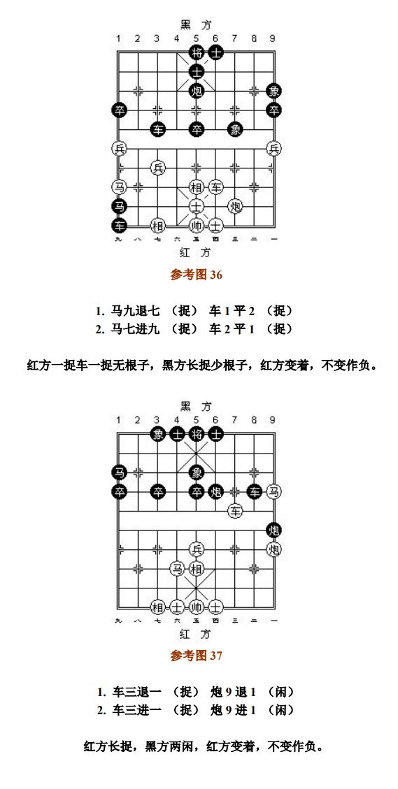 24.13 禁止着法:凡单方面走出长将、长杀、长捉、一将一杀、一将一捉、一杀一捉等循环重复的攻击性着法,统称为"禁止着法"(图8、参考图10)。
