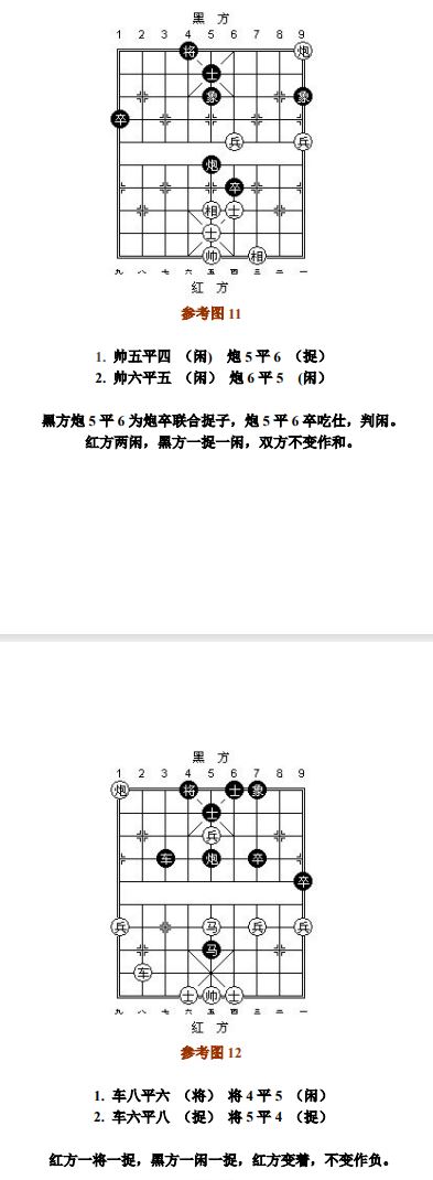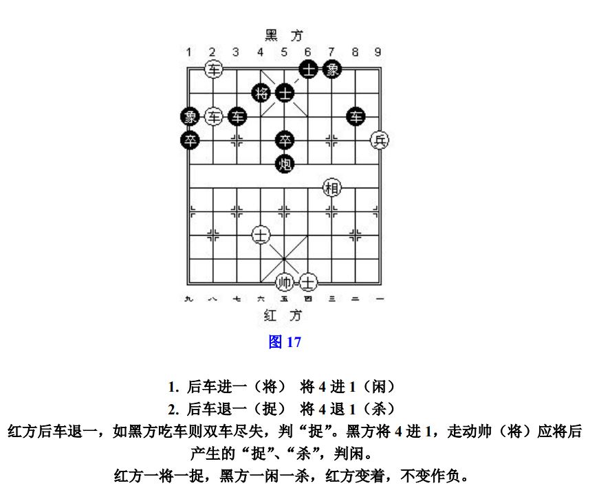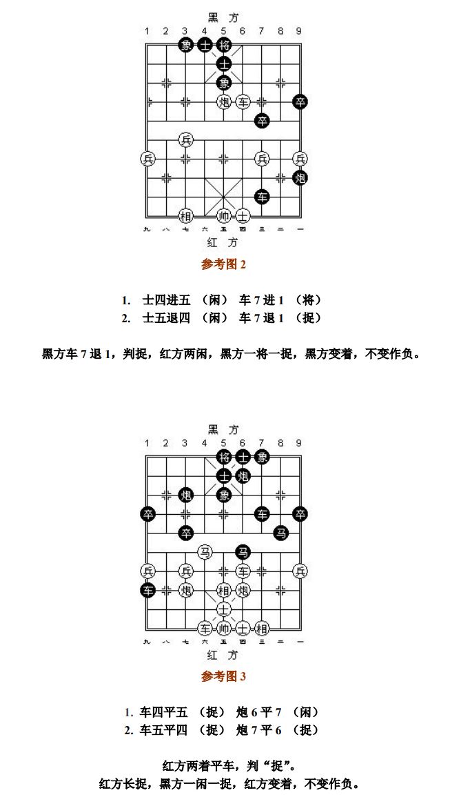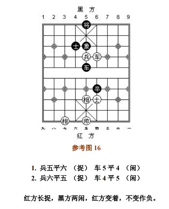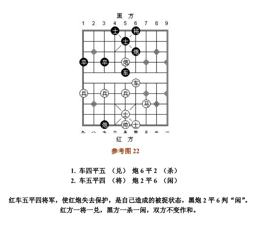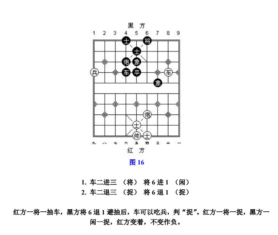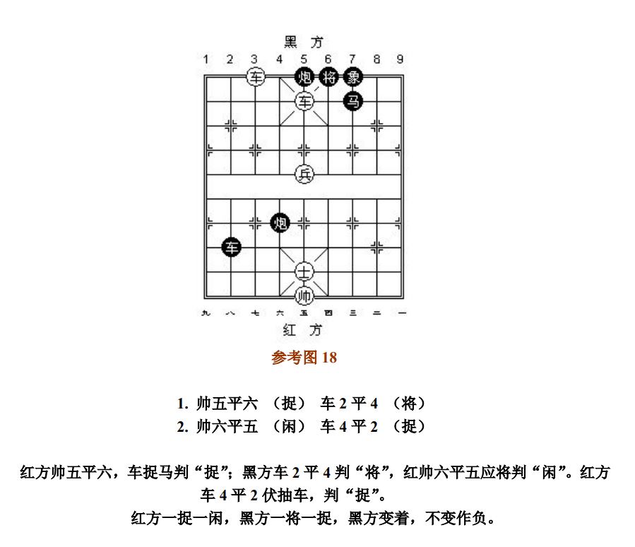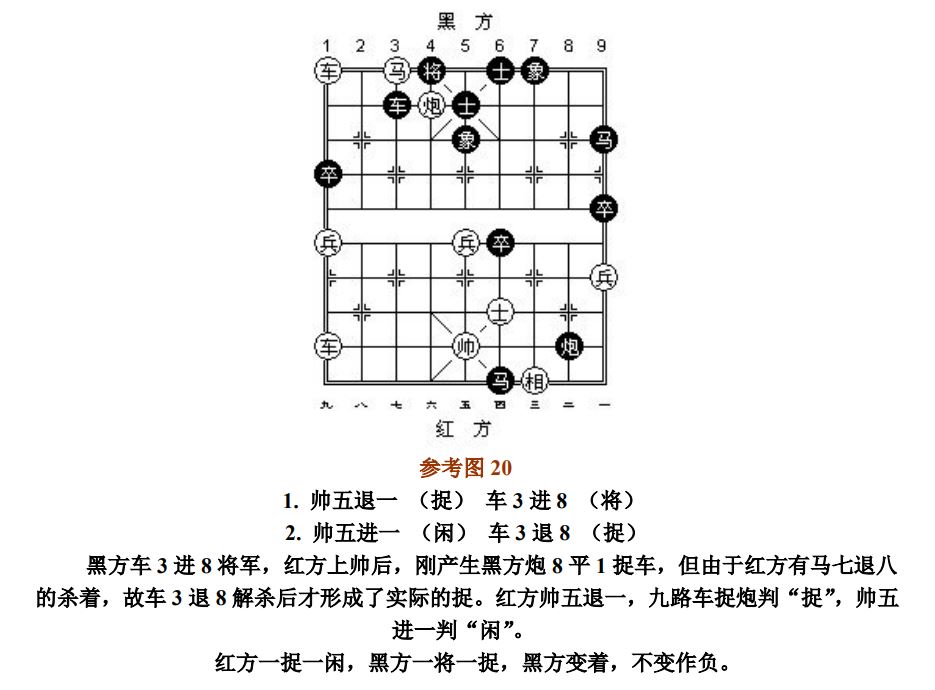 26.1.2 走动帅(将)应将而产生的"捉"、"杀",按"闲"处理;走动其他子应将后产生新的"捉"或"杀",按"捉"或"杀"处理(图16~图17、参考图17~参考图18)。