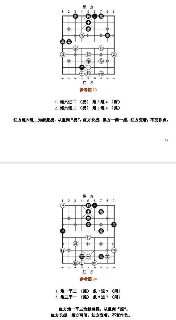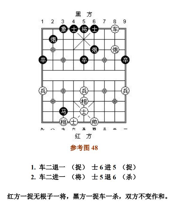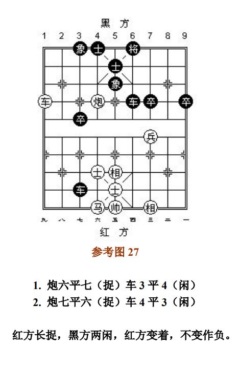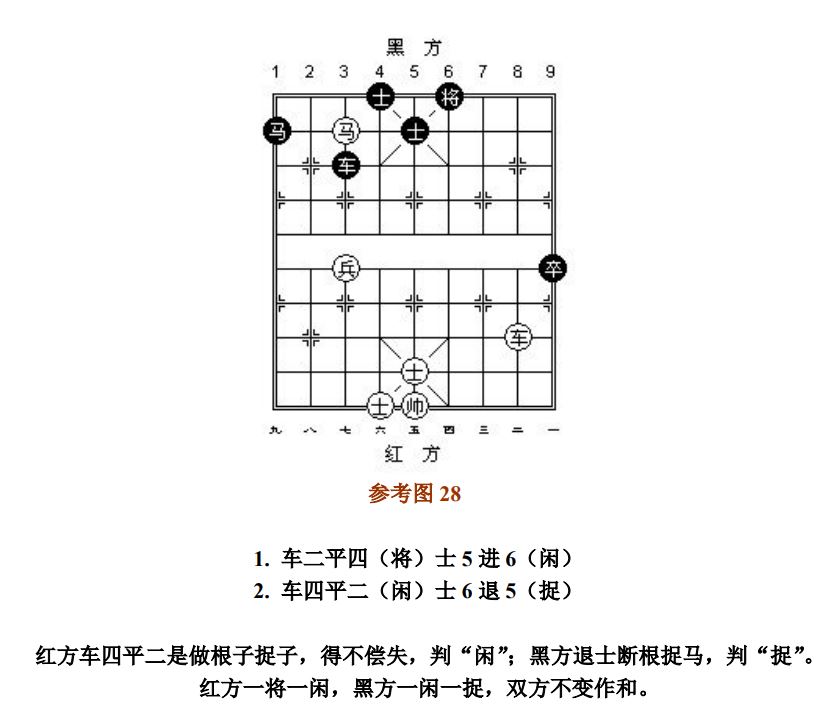 26.5 做"根"子和被"牵"子捉子及各吃各子的捉子,完整互吃后价值相当或得子者,按"捉"处理;得不偿失者,按"闲"处理(图22~图23、参考图27~参考图28)。做"根"子捉子时,若先丢被保护子,后吃对方子,双方等值交换则为"闲"。