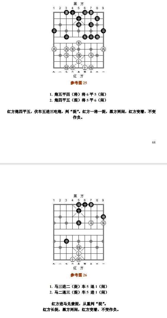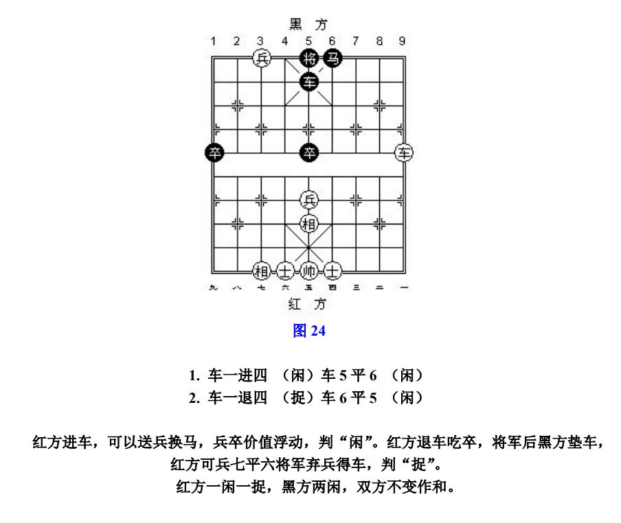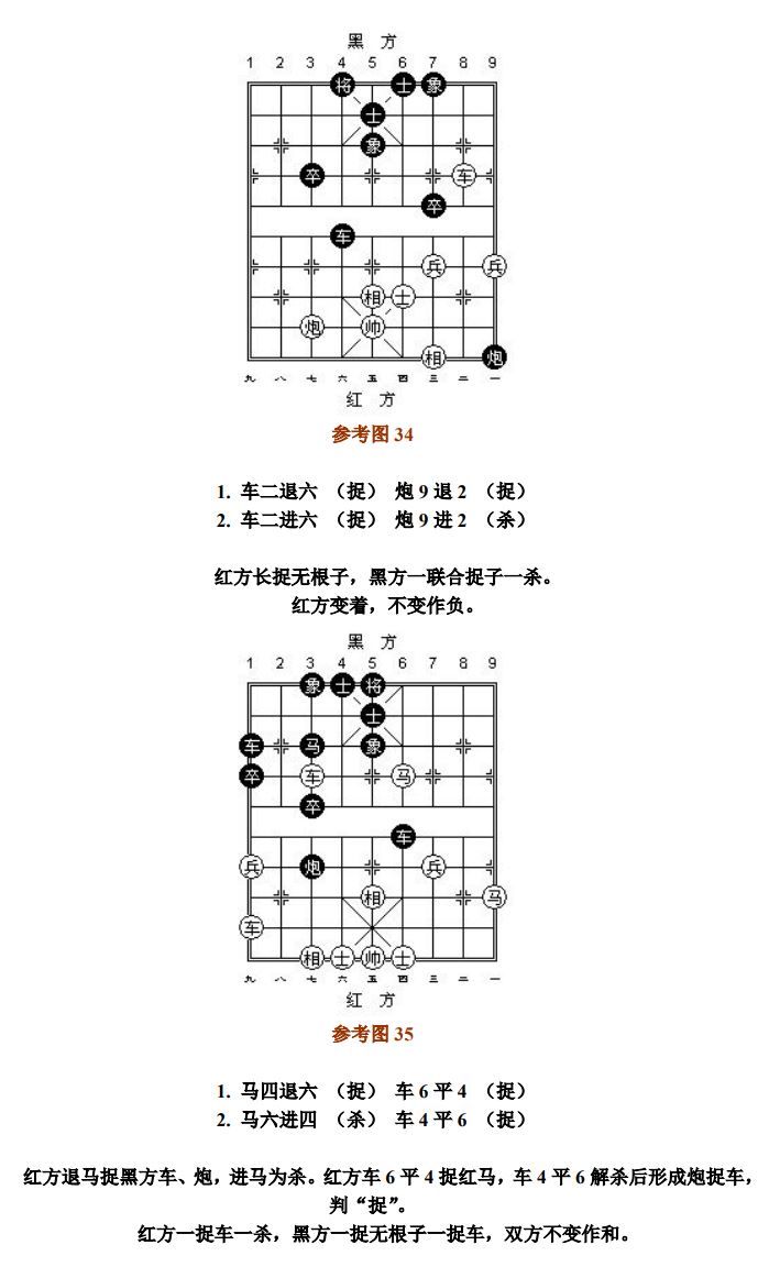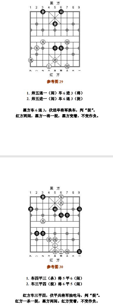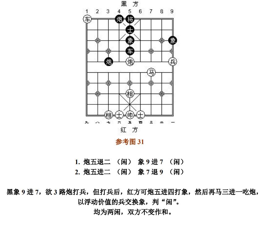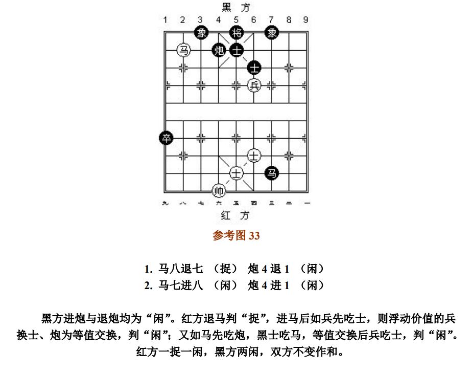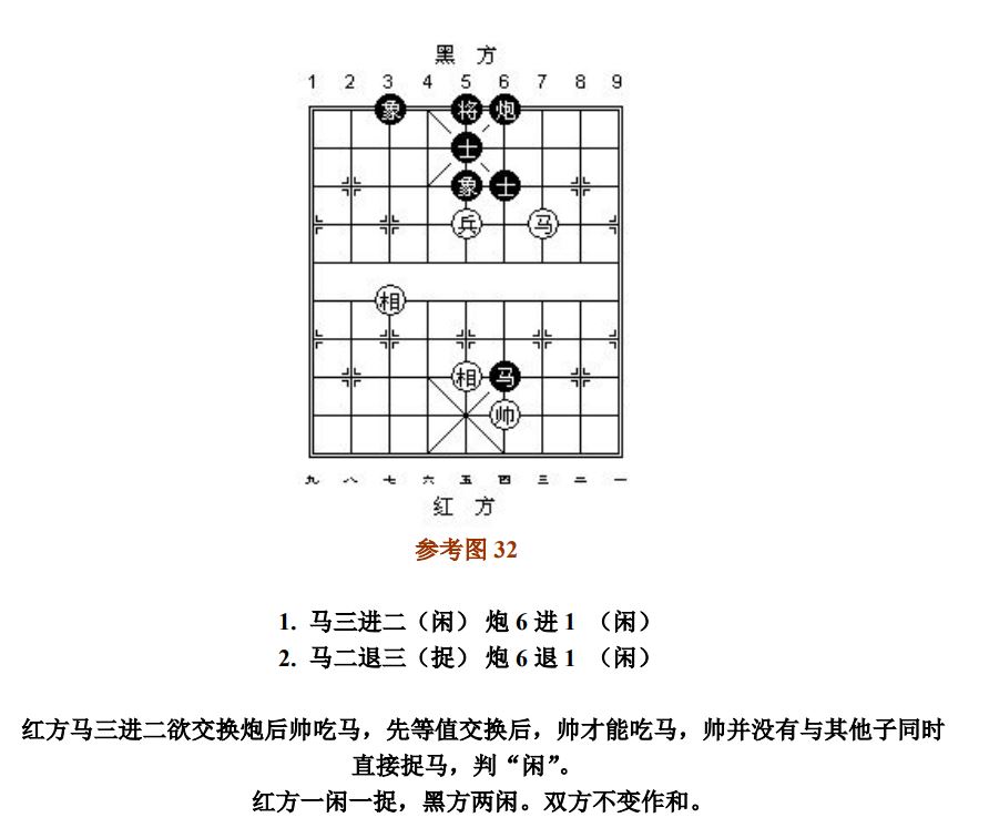 26.8 兵(卒)借其他子抽吃对方的子,按"闲"处理;兵(卒)吃子的产生其他子"将军",按"捉"处理。其他子完成互吃等值交换过程后,兵(卒)或帅(将)的最后吃子,按"闲"处理。如前述交换过程为不等值,或兵(卒)、帅(将)与其他子共同擒捉的是对方同一个子,则兵(卒)或帅(将)的最后吃子,按"捉"处理(参考图32~参考图33)