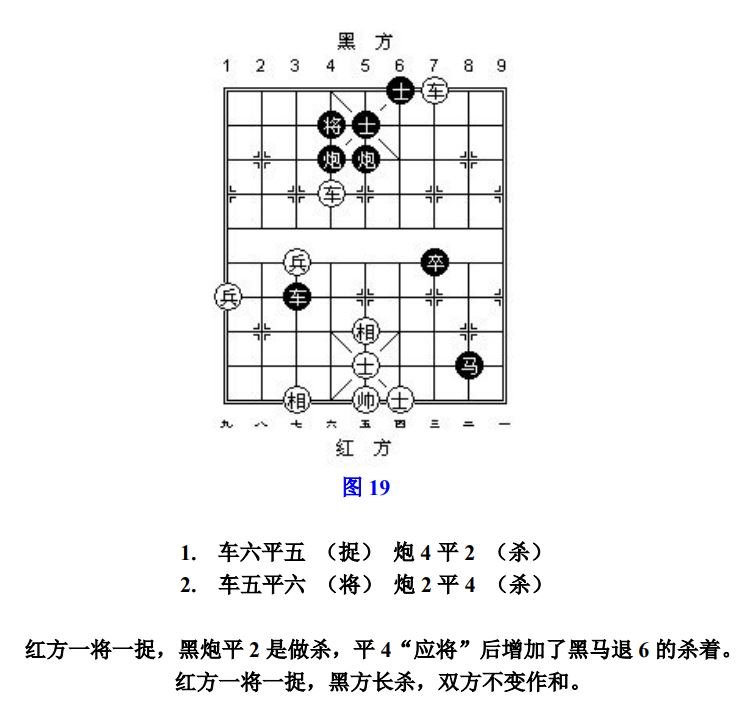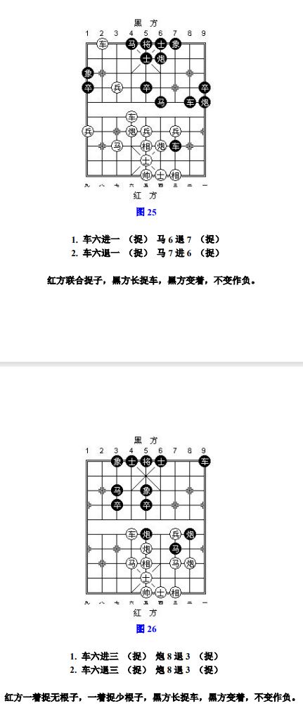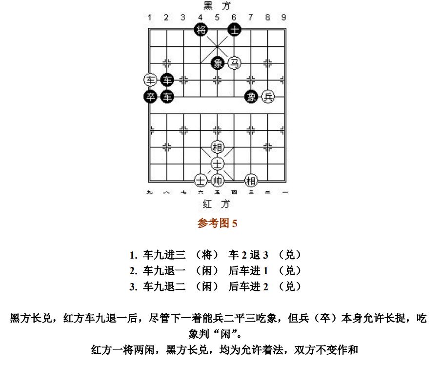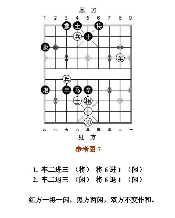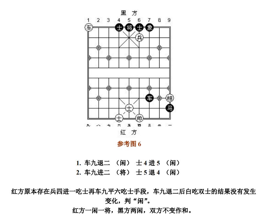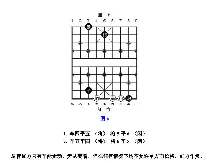 24.9 长将:凡走子连续不停将军而形成循环达三次者,称为"长将",首着吃子不计算在内(图6)。