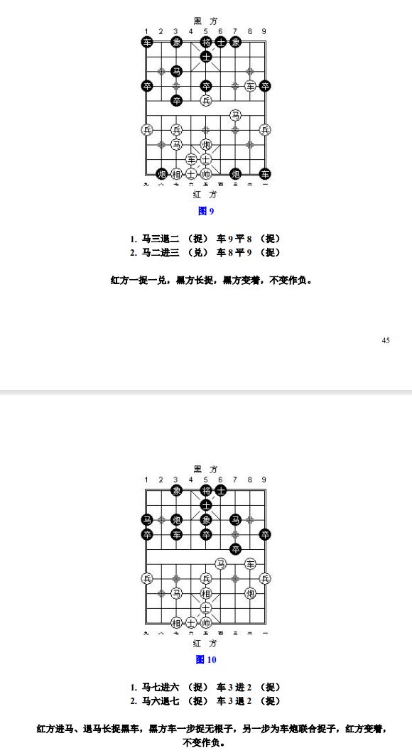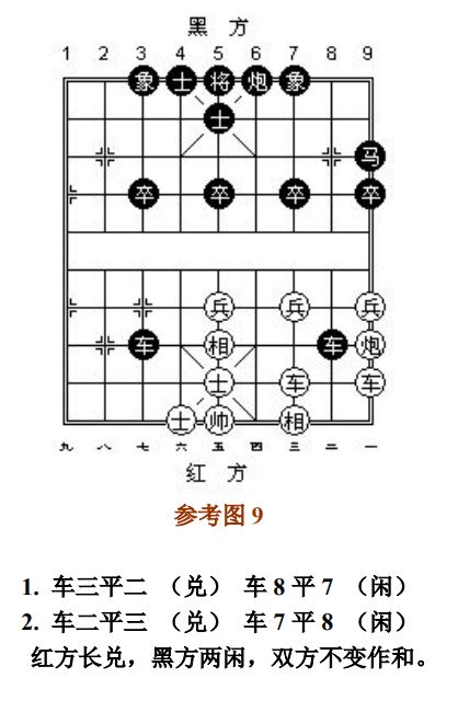 24.12 长兑:凡走子连续不停邀兑达三次者,称为"长兑"(参考图9)。类似解释也适用于"长献"、"长拦"、"长跟"。