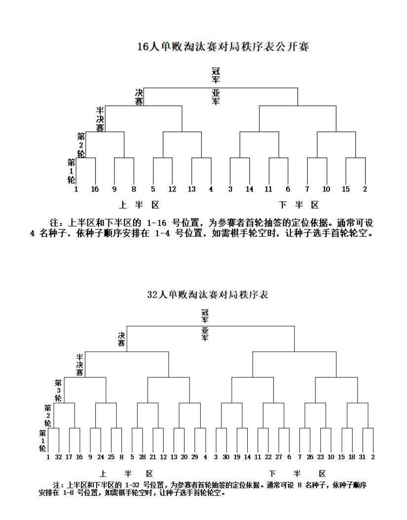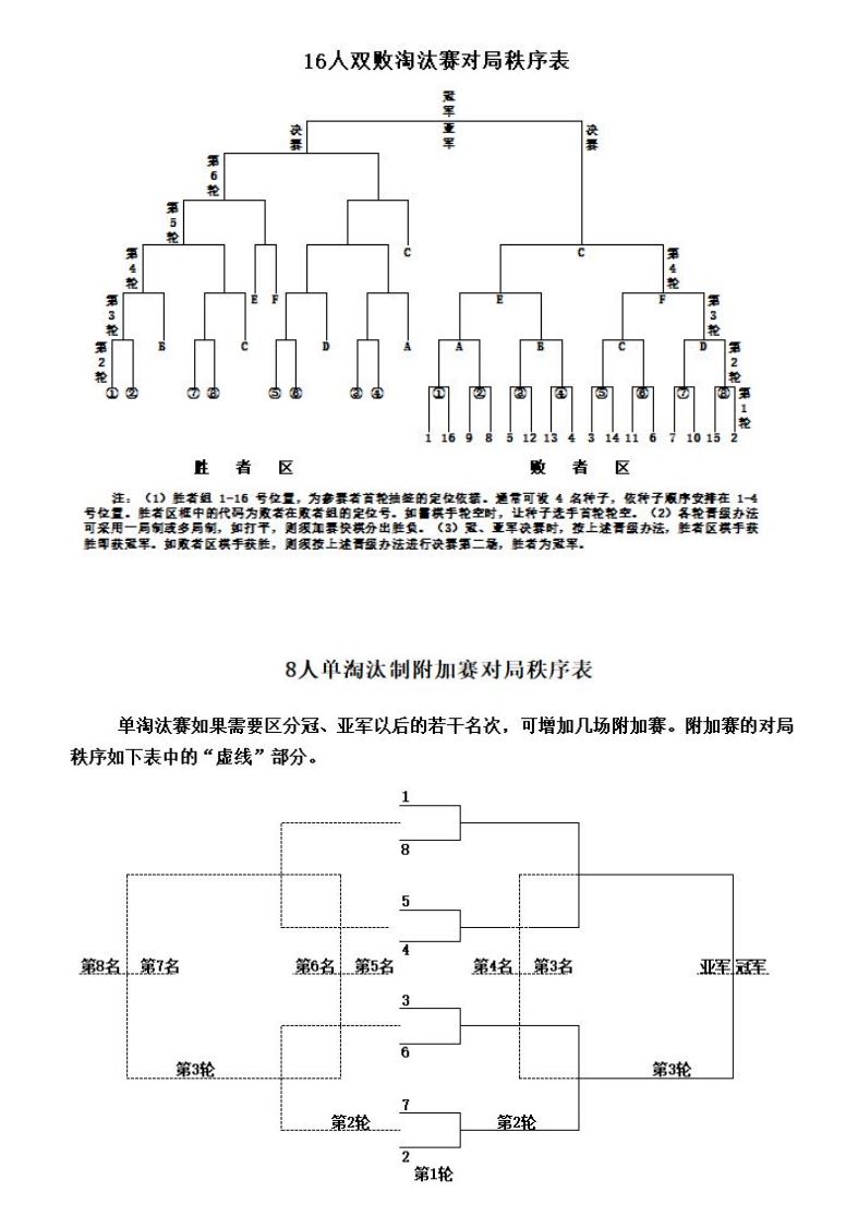 参加比赛的人(队)数较多,时间较紧,可酌情采用单败淘汰制、双败淘汰制或交叉淘汰等其他淘汰方式,并适当安排预选赛、附加赛。单败淘汰赛、双败淘汰赛和单淘汰制附加赛对局秩序表参见附录四。