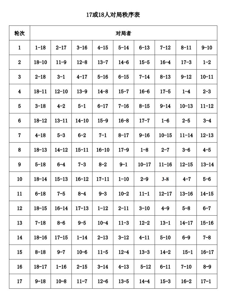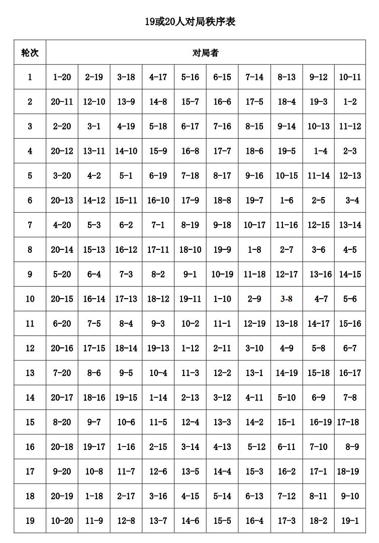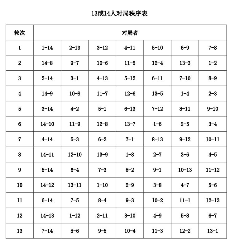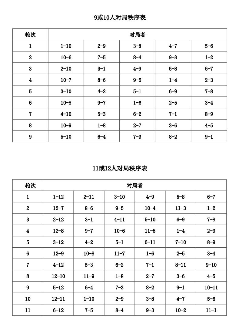 12.1 循环制个人比赛,按照附录二《循环赛对局秩序表》来确定,表上每轮号码列前者执红棋。
