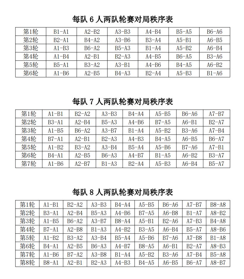 适用于队与队之间的对抗赛,一方所有队员与另一方所有队员逐一对弈。全队轮赛制对局秩序表见附录五。