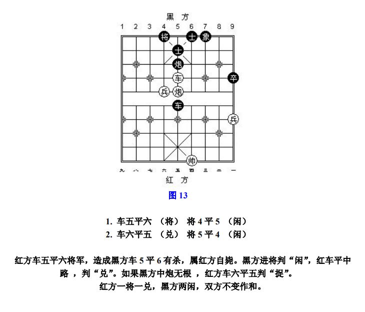24.18 自毙:甲方"将军"乙方,以致形成己方的被杀状态,如乙方用除帅(将)以外其他子"应将"的着法不属将、杀或捉,则甲方"将军"这着棋称为"自毙"(图13)。