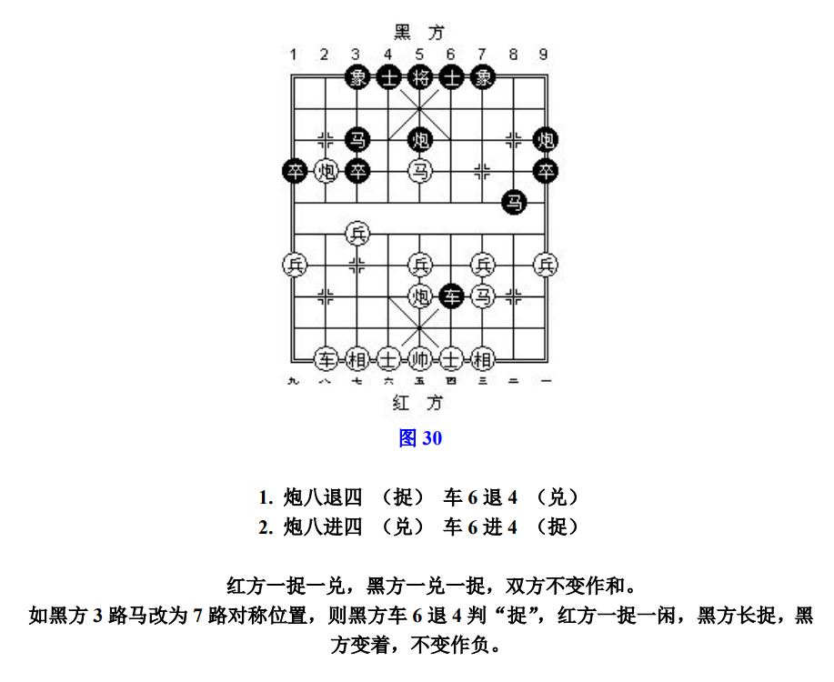 26.10 同兵种邀兑,被邀兑方兑子后立即被杀或子力价值受损,邀兑方按"捉"处理;反之,则按"兑"处理。如邀兑之子参与作杀(与其他子配合连续将军),则按"杀"处理(图29)。