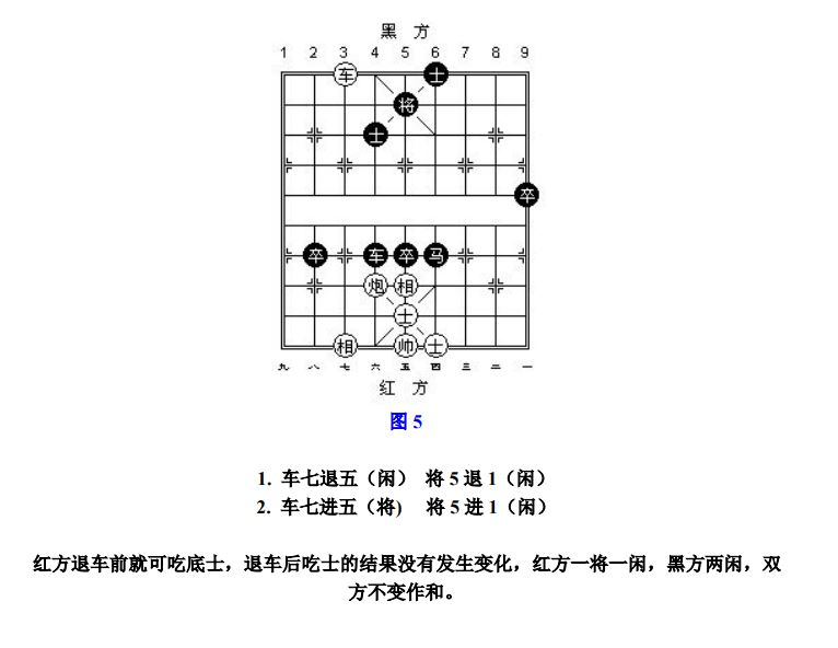 24.8 闲:凡走子性质不属于将、杀、捉者,统称为"闲"。兑、献、拦、跟,均属于"闲"范畴(图5、参考图6~参考图7)。